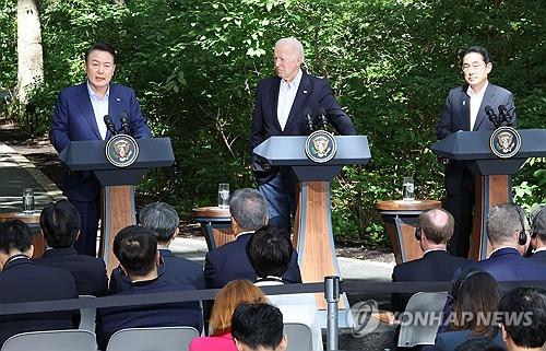 한미일 정상은 작년 8월 캠프데이비드 정상회의 때 적어도 1년에 한 번 3국 정상회의를 열기로 합의했다.