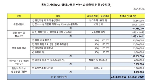 동덕여대는 15일 홈페이지 공지를 통해 "외부 업체의 추정액으로 정확하지는 않지만, 피해 금액은 24억4천434만원에서 54억4천434만원으로 추정된다"고 밝혔다.