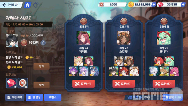 이 외에도 비동기식 PvP로 자신이 육성한 덱의 강함을 겨루는 아레나 콘텐츠가 있다. 성장 던전 콘텐츠인 보석던전과 성장훈련소에서는 던전 클리어를 통해 다양한 성장 재화를 획득할 수 있다.