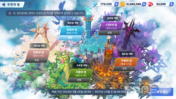 무한의 탑은 속성별 덱을 구성하여 높은 층을 계속해서 공략하는 도전형 콘텐츠다. 이용자는 요일별 오픈되는 불, 물, 자연, 어둠, 빛 등 총 5개의 탑에서 필수 속성의 캐릭터들을 육성하고 덱을 구성해 최고층에 오르기 위한 도전을 하게 된다. 새로운 덱으로 각 탑을 공략하여 매번 새로운 전략적 재미를 느낄 수 있다.