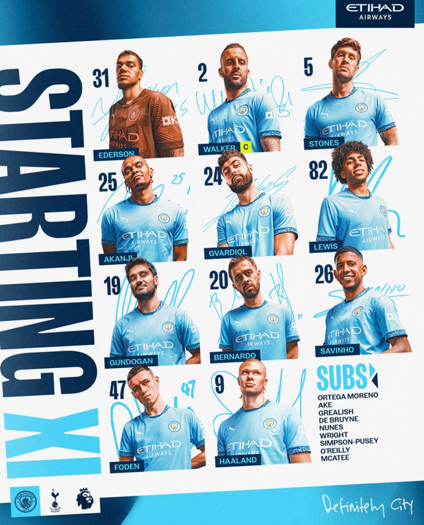 홈팀 맨체스터 시티는 4-2-3-1 전형을 꺼냈다. 에데르송이 골키퍼 장갑을 꼈고 요슈코 그바르디올, 마누엘 아칸지, 존 스톤스, 카일 워커가 수비진을 구축했다. 일카이 귄도안과 리코 루이스가 허리를 받쳤다. 사비우, 필 포든, 베르나르두 실바가 2선에서 최전방의 엘링 홀란을 지원했다.