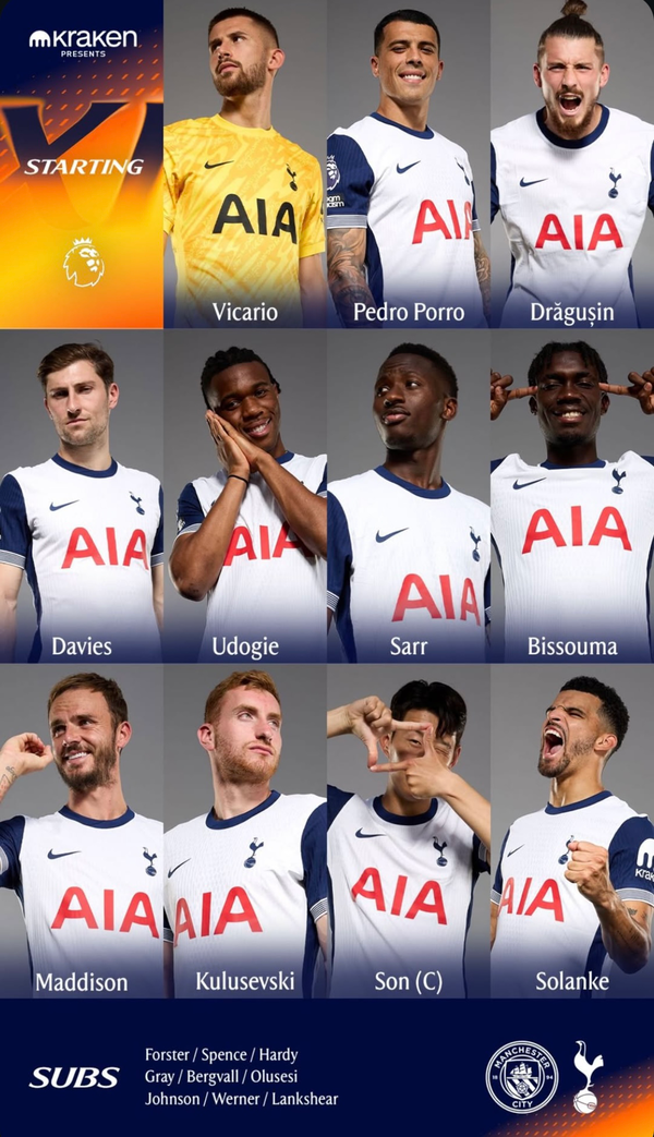 원정팀 토트넘은 4-3-3 전형으로 맞섰다. 굴리엘모 비카리오가 골문을 지킨 가운데 데스티니 우도기, 벤 데이비스, 라두 드라구신, 페드로 포로가 수비라인에서 호흡을 맞췄다. 중원은 제임스 매디슨, 이브 비수마, 파페 마타르 사르가 맡았다. 손흥민, 도미니크 솔란케, 데얀 쿨루세브스키가 공격을 이끌었다.