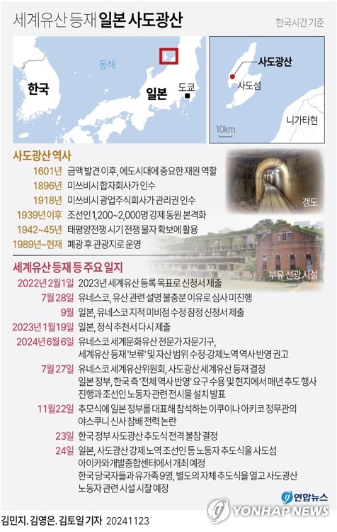 사도광산은 에도시대(1603∼1867)에 금광으로 유명했던 곳으로 태평양전쟁이 본격화한 후에는 구리 등 전쟁 물자를 확보하는 광산으로 주로 이용됐다. 이 무렵 1천500여 명으로 추산되는 조선인들이 강제 동원돼 혹독한 환경 속에서 일했다.