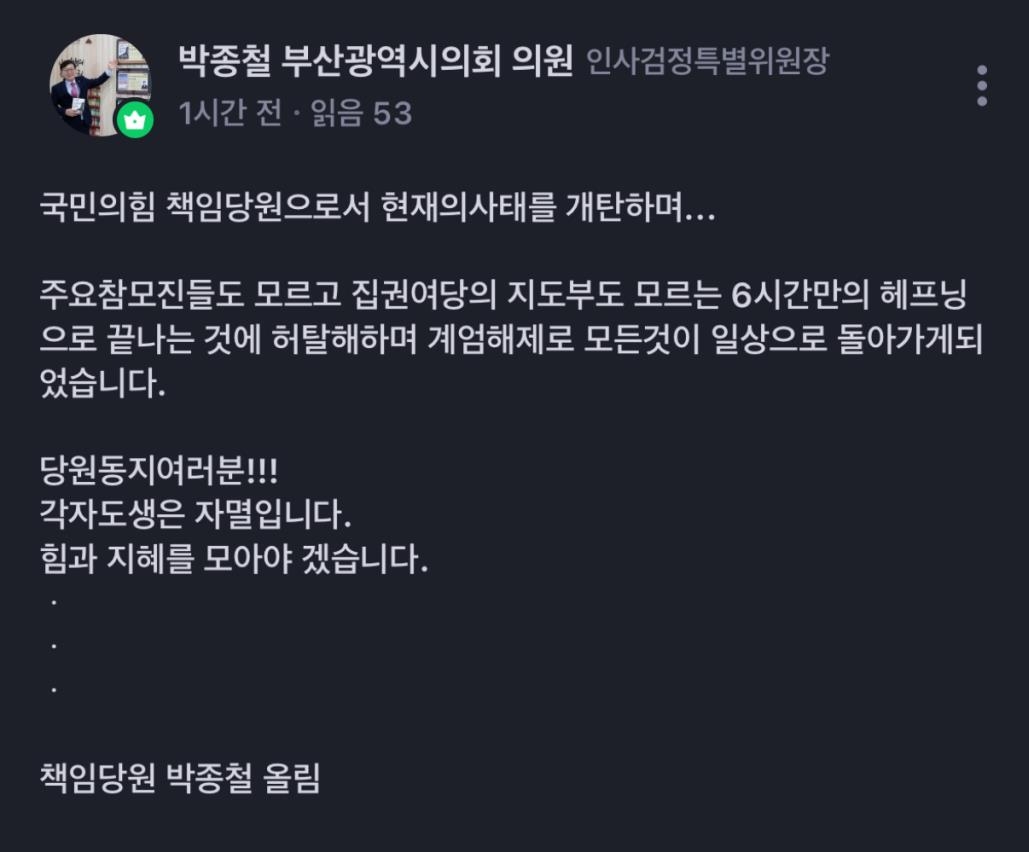 박 시의원은 이어 4일 오전 8시께 추가로 올린 게시물에서 "주요 참모진들도 모르고 집권당의 지도부도 모르는 6시간 만의 해프닝을 끝나는 것에 허탈해하며 계엄 해제로 모든 것이 일상으로 돌아가게 됐다"고 말했다.