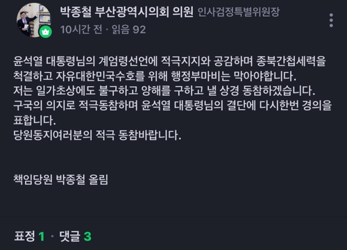 (부산=연합뉴스) 손형주 기자 = 국민의힘 소속 부산시의원이 지난밤 비상계엄이 선포될 당시 적극 지지한다는 글을 올렸다가 사퇴 압박을 받고 있다.