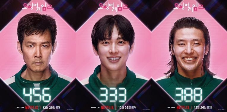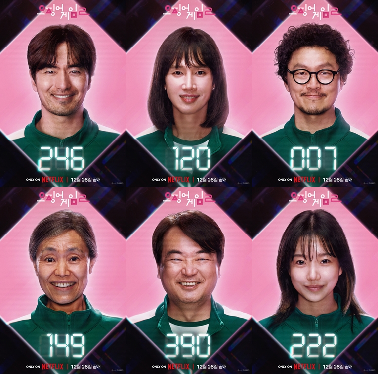 공개된 '오징어 게임' 시즌2 1차 캐릭터 포스터는 작품 속 게임 참가자들이 게임 참가 직전에 찍는 프로필 사진을 연상시킨다. 게임을 끝내기 위해 돌아온 456번 기훈의 포스터는 웃음기 없는 진지한 표정으로 이 게임이 처음인 다른 참가자들과 대조된다.