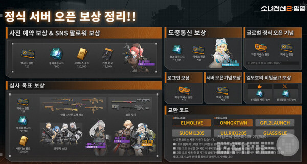 글로벌 출시인 만큼 다양한 보상도 준비되어 있다. 사전예약 500만 명 돌파 보상으로 전술인형 치타와 액세스 권한 10회 등 다양한 보상을 시작으로 7일간 접속만해도 지정 액세스 권한을 지급하는 엘모호 시동 이벤트도 함께 진행된다.
