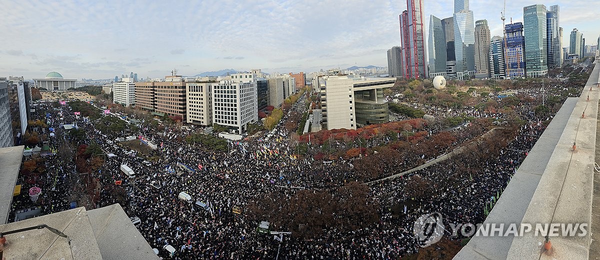 (서울=연합뉴스) 이동환 김준태 이율립 최윤선 기자 = 7일 탄핵소추안 표결을 앞두고 윤석열 대통령 퇴진을 촉구하는 시민들이 국회 앞에 집결했다.