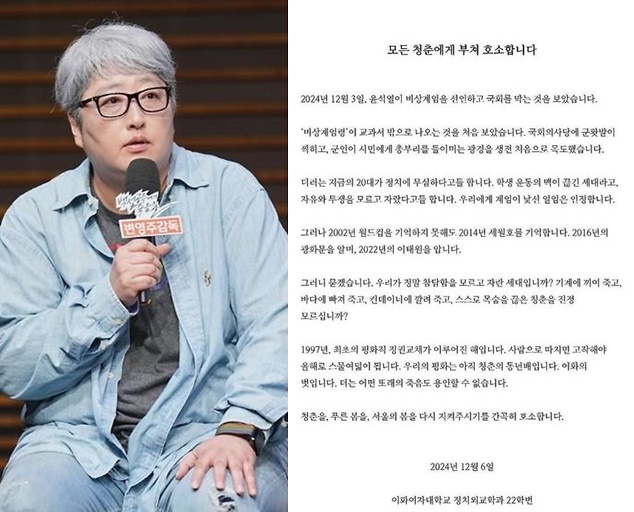 6일 변영주 감독은 "어떤 내일이 다가오더라도 발바닥에 힘주고 계속 일어서서 스스로의 존엄을 지키는 방법"이라는 글과 함께 윤석열 대통령의 비상계엄 논란과 관련해 이화여자대학교 정치외교학과 22학번 학생들이 쓴 성명문을 공유했다.