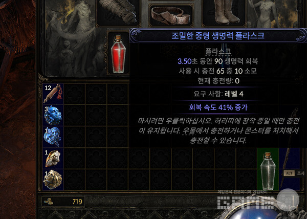 디아블로4의 경우 5개나 6개 정도의 아이콘으로 표시되어 있어 체력이 몇 개가 남았는지 직관적으로 알 수 있었다. 패스 오브 엑자일 2에서는 크게 한 병이라고 보고, 설명대로 사용시마다 10씩 소모된다고 보면 된다.