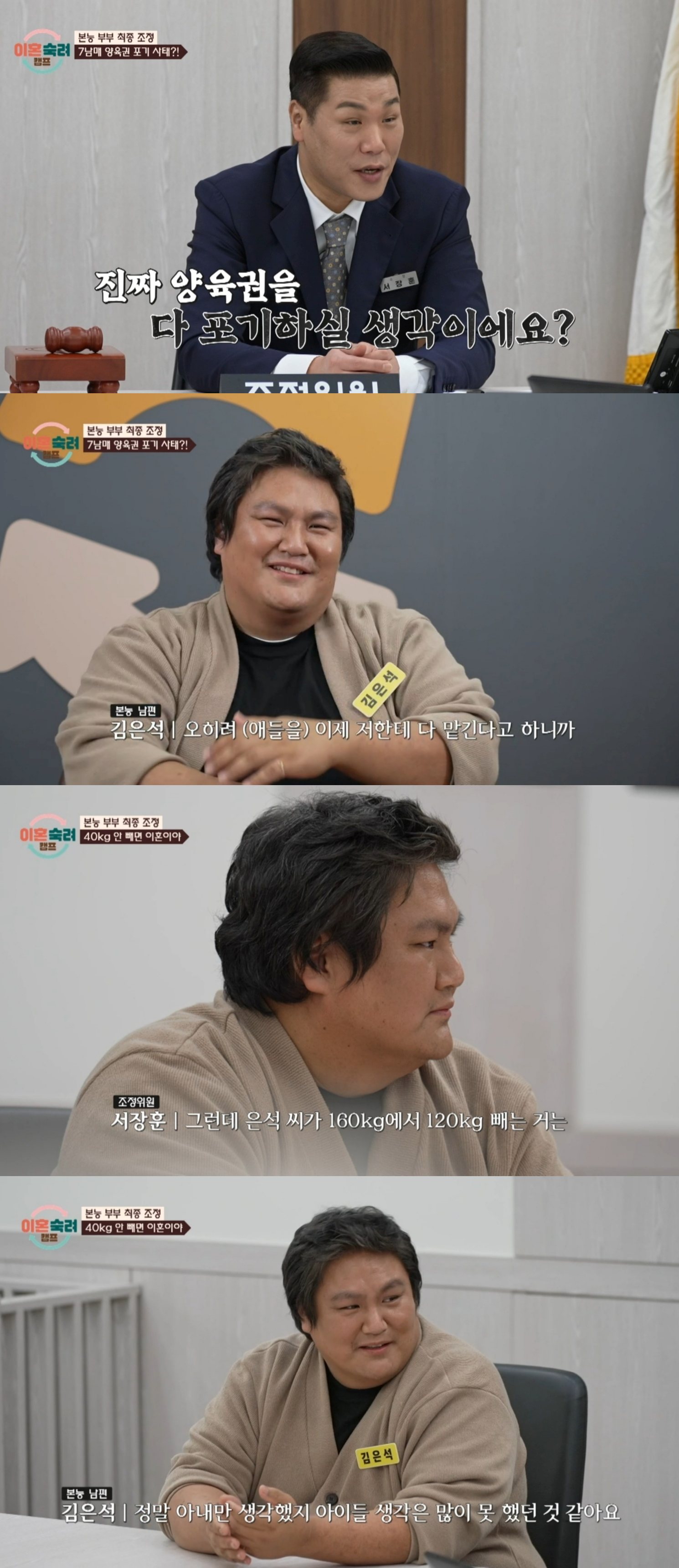 이날 아내 측은 카드 이용료로 나무라는 것, 경제활동을 하지 않는 부분의 개선을 요구했고, 마지막 조건으로 160kg인 체중을 40kg 감량할 것을 요구했다.