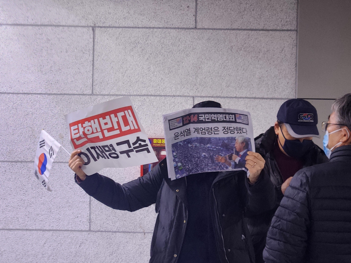 한 참가자는 '윤석열 계엄령은 정당했다'는 내용이 담긴 신문을 역을 오가는 사람들에게 건네면서 탄핵 반대 구호를 외쳤다.