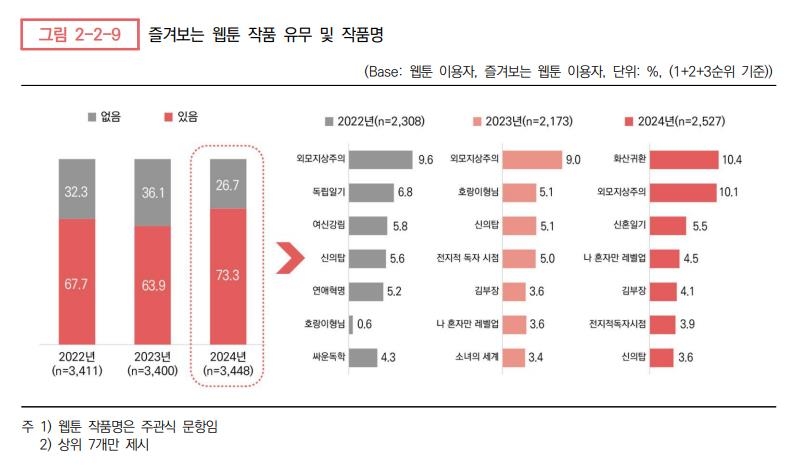 이 조사는 올해 5월 20일부터 한 달간 웹툰을 2∼3개월에 1회 이상 본 10∼69세 국민을 대상으로 진행했으며, 즐겨보는 웹툰 3개를 주관식으로 답하도록 했다.
