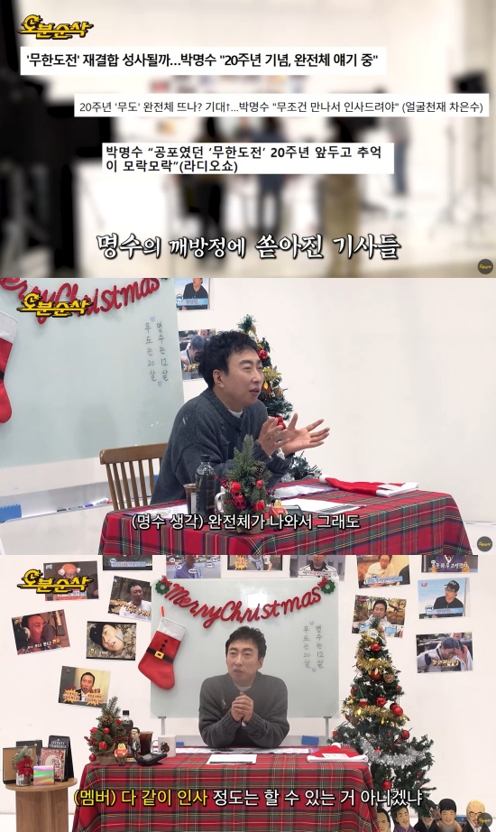 이날 박명수는 '무도' 20주년과 관련해 '깨방정'을 떨어 기사가 여럿 난 것과 관련해 "실제로 (20주년과 관련해) 제 이야기를 좀 했다"며 "완전체가 나와서 (멤버들이) 다 같이 인사 정도는 드릴 수 있는 거 아니겠냐고 얘기를 건넸다"고 전해 팬들의 기대를 높였다.