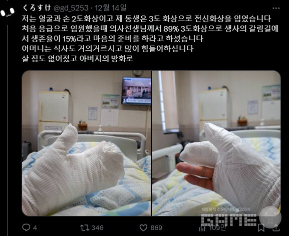 게시글 작성자는 “해당 사건으로 인해 동생이 3도 전신화상을 입었고, 방화로 인해 살 집이 사라졌을 뿐만 아니라 보험 혜택도 받을 수 없어 어려운 상황이다. 동생이 겨우 산소호흡기를 떼었는데 수술할 수 있게 도움 부탁드린다”라며 안타까운 사연을 전했다.