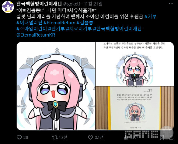 게이머들의 따뜻한 기부는 이번이 처음이 아니다. 작년 12월에는 넥슨어린이재활병원에 기부 릴레이가 이어진 적이 있으며, 올해 11월에는 ‘이터널리턴’의 이용자가 한국백혈병어린이 재단에 기부하며 이용자들의 큰 관심을 받은 바 있다.
