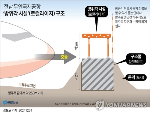 (무안·서울·세종=연합뉴스) 형민우 김보경 임성호 기자 = 무안국제공항에 설치된 방위각 시설(로컬라이저)과 이를 지지하기 위해 지상으로 돌출된 형태로 만들어진 콘크리트 구조물(둔덕)이 제주항공 여객기 참사를 키웠다는 지적이 계속해서 제기되고 있다.
