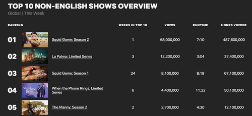 (서울=연합뉴스) 김경윤 기자 = '오징어 게임 시즌2'(이하 오징어 게임2)가 전 세계에서 약 5억 시간 가까이 시청되며 공개 첫 주 기준으로 넷플릭스에서 가장 많이 본 콘텐츠로 꼽혔다.