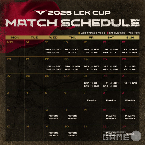 2025 LCK컵은 15일(수) 오후 5시 OK저축은행 브리온과 DRX의 대결로 포문을 연다. 그룹 대항전은 내달 2일(일)까지 열리고 플레이-인은 2월 7일(금)부터 9일(일)까지, 12일(수)부터 시작되는 플레이오프는 2월 23일(일) 대망의 결승전으로 막을 내린다.