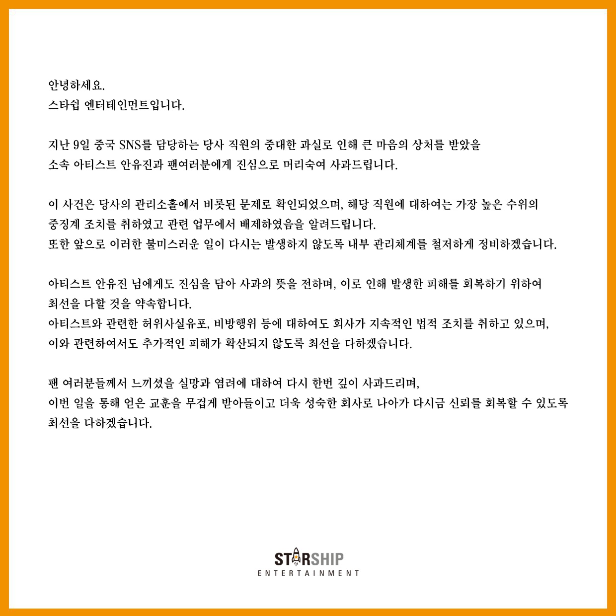 이하 스타쉽 엔터테인먼트 사과문 전문.