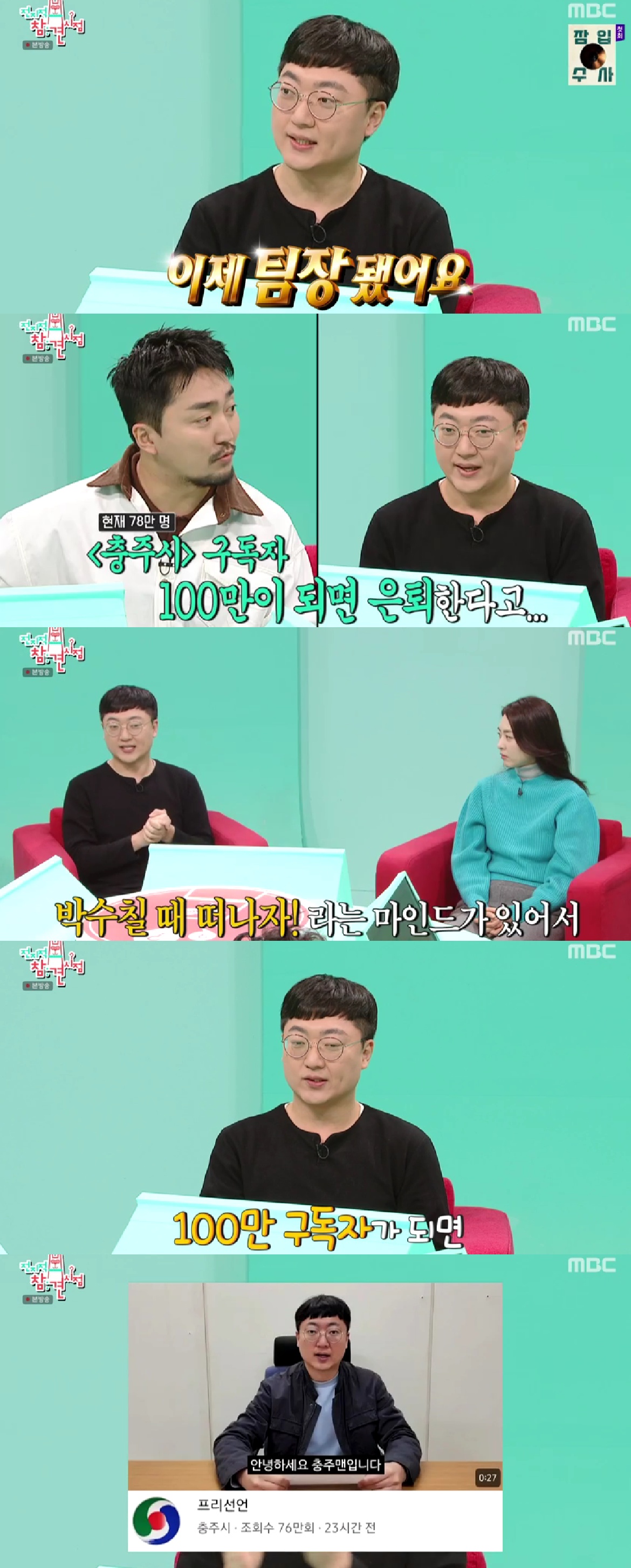 '충주시' 유튜브 구독자가 100만명이 되면 은퇴하겠다는 충주맨은 "박수칠 때 떠나자! 이런 마인드가 있다. 100만 구독자를 달성하면 다른 업무를 하고 싶다"고 밝히더니 "(전참시도) 자리가 넉넉한 거 같더라"며 패널 자리까지 욕심 냈다.