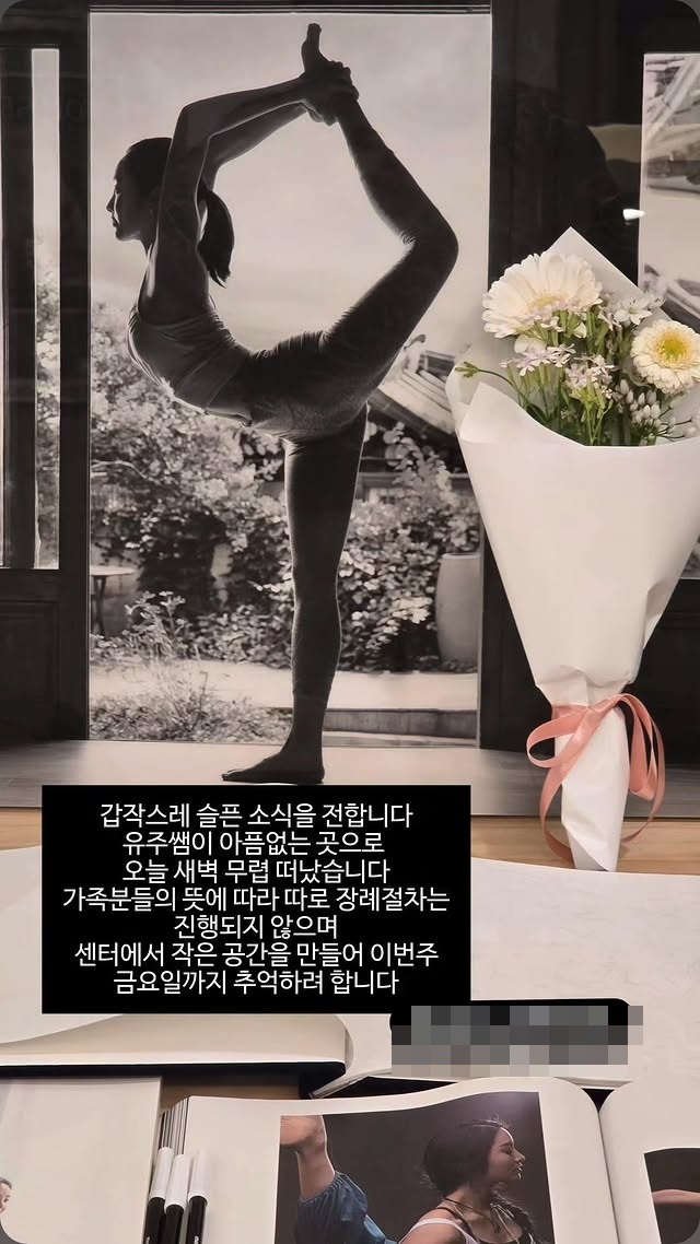 게시물을 통해서도 "갑작스러운 슬픈 소식을 전합니다. 이유주 선생님이 어제 (2월18일) 세상을 떠났습니다. 유가족들의 뜻에 따라 장례식과 빈소는 따로 마련하지 않으며 유주 선생님이 운영했던 요가움에서 마지막 인사를 할 수 있는 공간을 이번 금요일까지 운영한다고 합니다"라고 전했다.