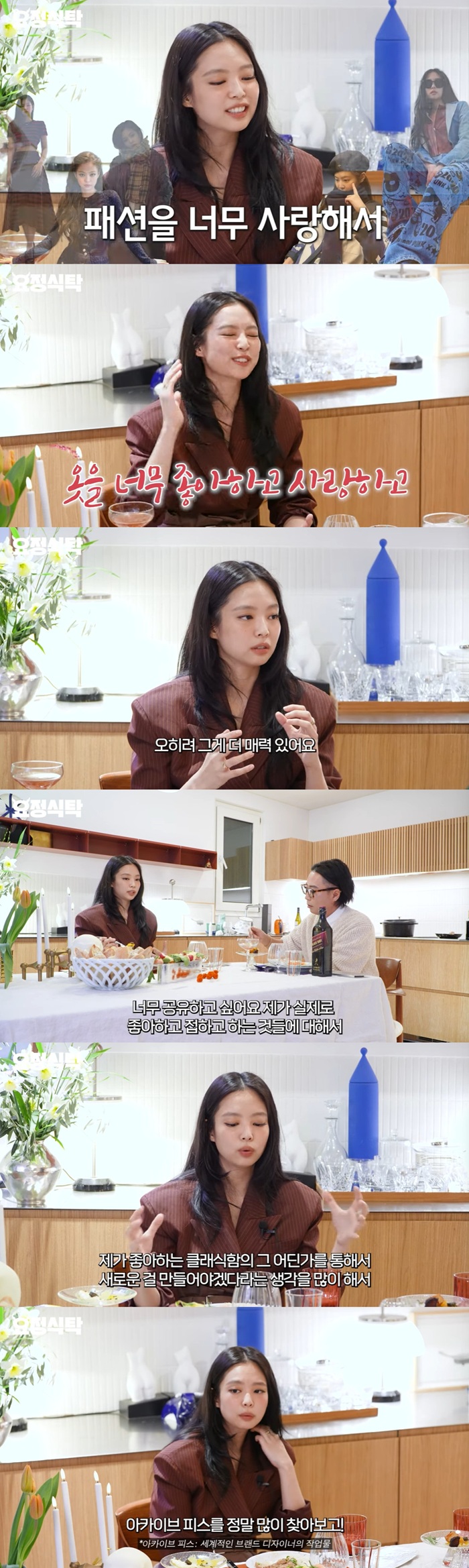 제니는 자신이 유행시킨 대형 가방이 언급되자 "지금 비춰지는 모습에는 하이패션 느낌이 많지만 실제로 전 패션을 너무 사랑해서 쉬는 날 아무것도 안하고 아이쇼핑만 해도 재밌다"며 자신의 취향을 언급했다.