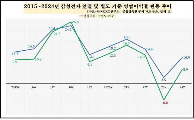 한편 삼성전자의 지난해 별도 기준 영업이익률(매출 대비 영업이익 비중)은 5.9%로, 2023년(-6.8%)을 제외하면 최근 10년새 가장 낮은 영업이익률을 보인 것으로 확인됐다. 지난해와 비슷한 매출 외형을 기록했던 2022년(12%)과 비교하면 절반 수준이다.