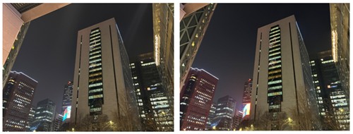 밤 9시경 아이폰 15로 같은 배경을 찍어 비교해보니 16e에서 불빛 표현이나 건물 색상이 더 선명했다.