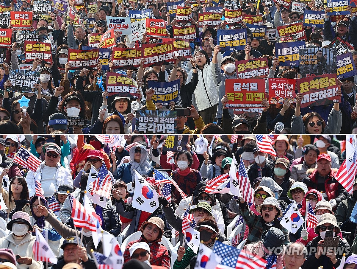 (서울=연합뉴스) 정윤주 홍준석 김준태 최윤선 기자 = 헌법재판소의 윤석열 대통령 탄핵심판 선고가 임박했다는 관측 속에 주말인 22일 서울 도심 곳곳에선 탄핵 찬반 진영의 대규모 집회가 열렸다.