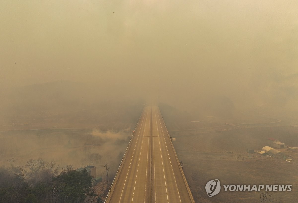 (김천·세종=연합뉴스) 이강일 임성호 기자 = 경북 의성에서 발생한 산불이 빠르게 확산하면서 인근 지역에서 고속도로 차량 통행과 철도 운행이 중단됐다.