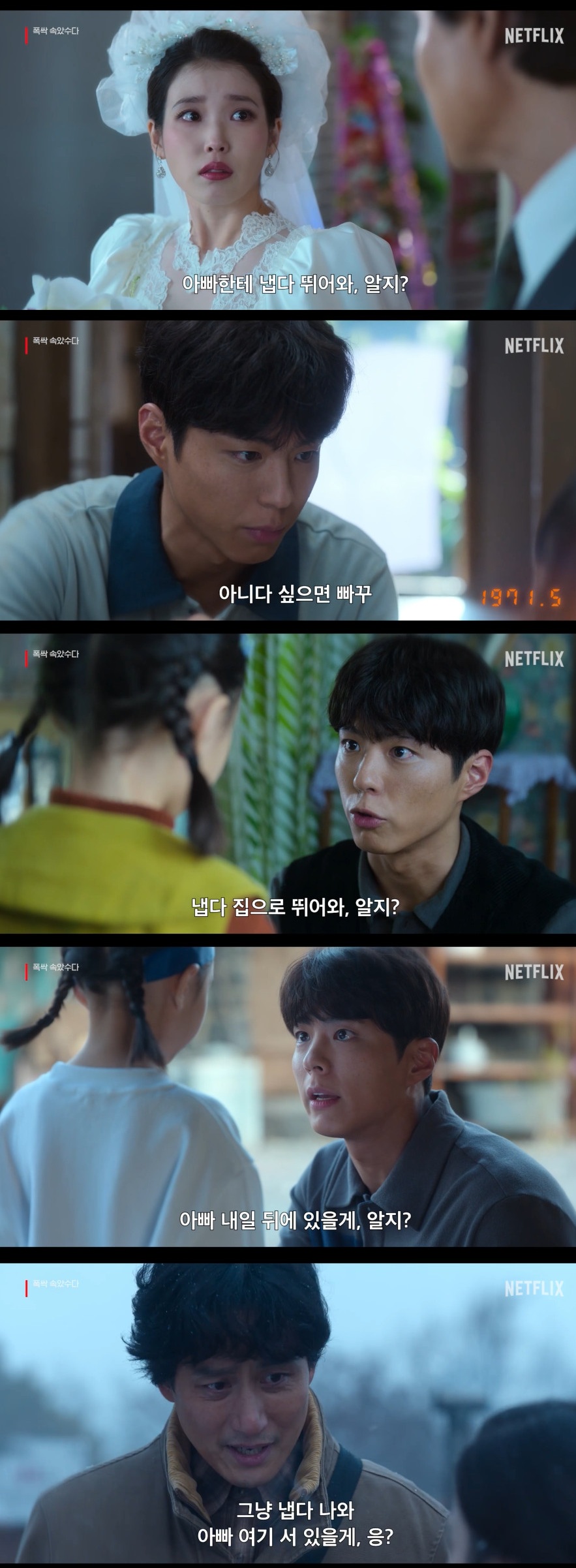 애순(아이유, 문소리 분)과 관식(박보검, 박해준)의 딸 금명(아이유)는 웨딩드레스를 입고 신부 입장을 앞두고 있어 눈길을 끈다.