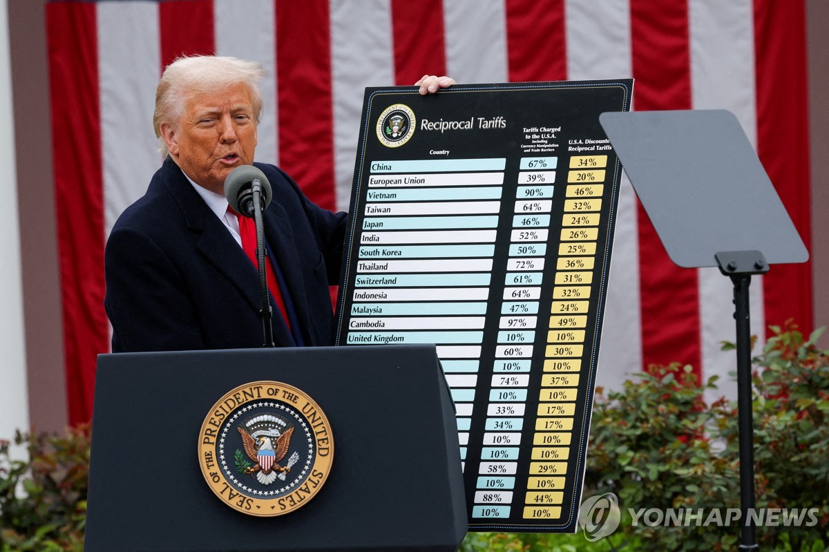 트럼프 대통령은 국가별 상호관세율이 일람표 형식으로 정리된 패널을 꺼내 들고, 표에 적힌 국가와 지역 이름을 순서대로 하나씩 거명하면서 상호관세율 등 수치와 책정 배경 등을 설명했다.
