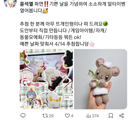게시자들은 해당 글을 공유하면 추첨을 통해 직접 만든 열쇠고리, 삽화, 카드, 등을 준다고 안내했다.