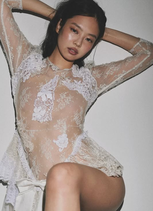 공개된 사진 속 제니는 누드톤의 레이스 의상을 입고 몽환적인 표정을 짓고 있는 모습이다. 이어진 사진에서는 맨몸에 트위드 재킷을 걸친 뒤 샤넬 목걸이로 포인트를 준 의상을 선보였다. 입을 벌리고 장난스러운 표정을 짓고 있다. 특히 상의 탈의를 하고 가슴만 가린 채 어딘가를 응시하며 노출 패션을 선보여 눈길을 끌었다.