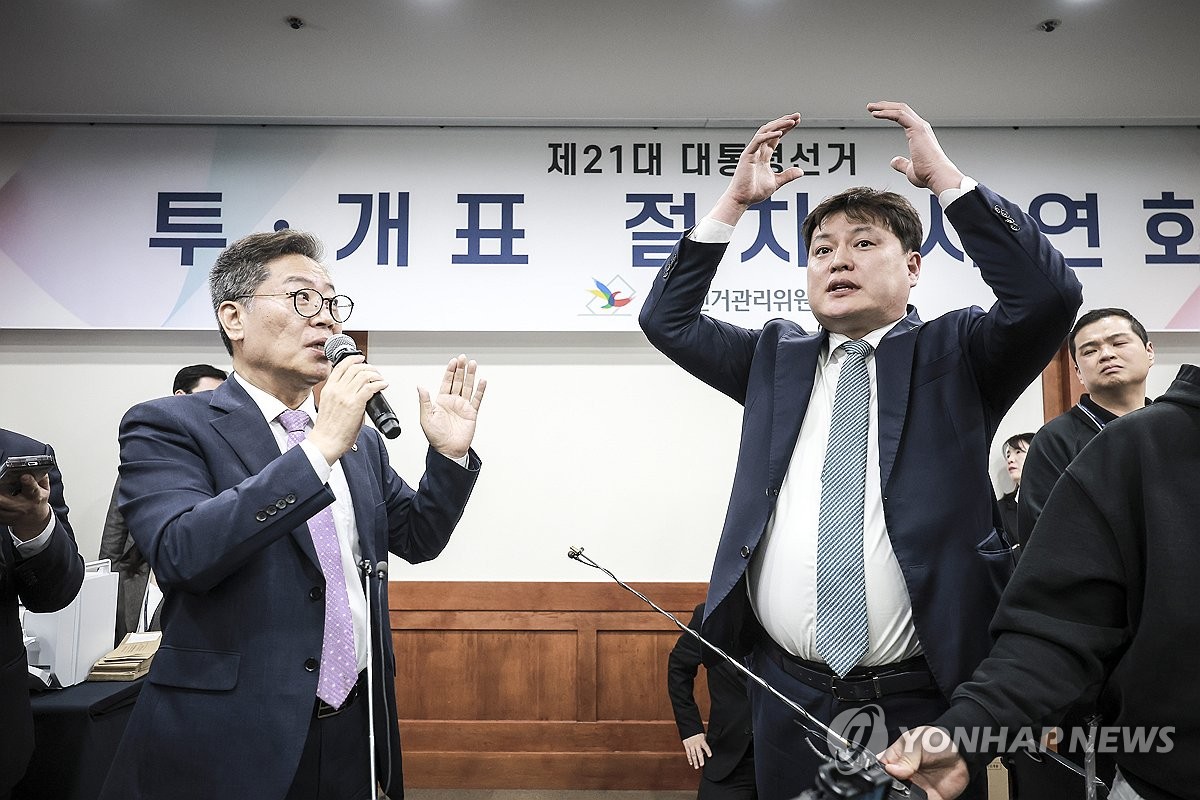 이에 투·개표 절차 시연 일정이 지연되면서 선관위 관계자들과 이들 사이에 고성이 오가기도 했다.