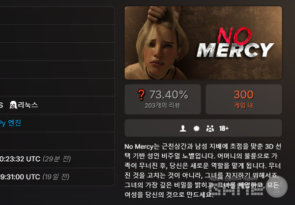 근친상간 성인 게임 '노 머시(No Mercy)', 결국 스팀 판매 중단