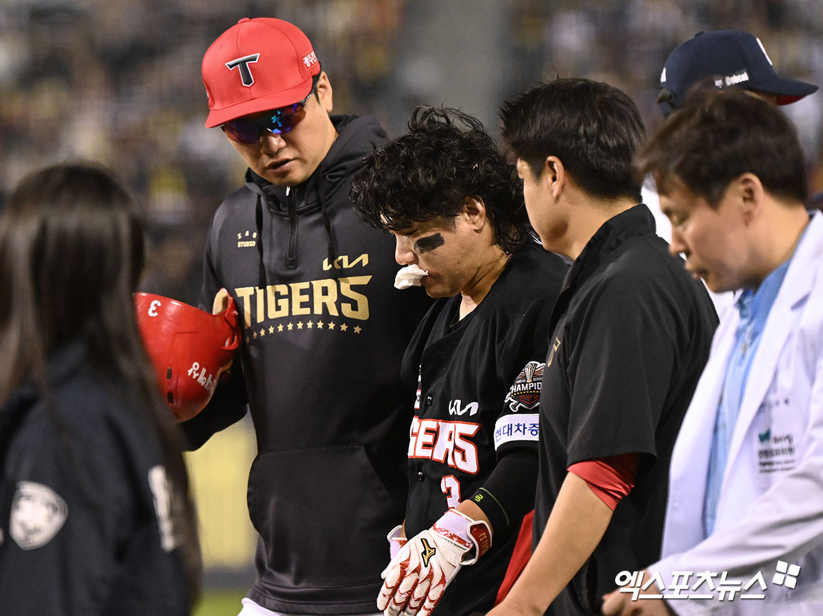 김선빈은 곧바로 쓰러져서 좀처럼 일어나지 못했다. 의료진이 한참 김선빈을 살펴본 가운데 다행히 김선빈은 스스로 일어나 부축을 받으면서 더그아웃으로 물러났다. 입에는 출혈을 막기 위한 붕대가 붙어 있었다.
