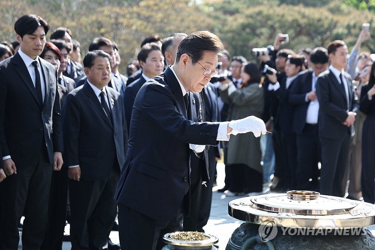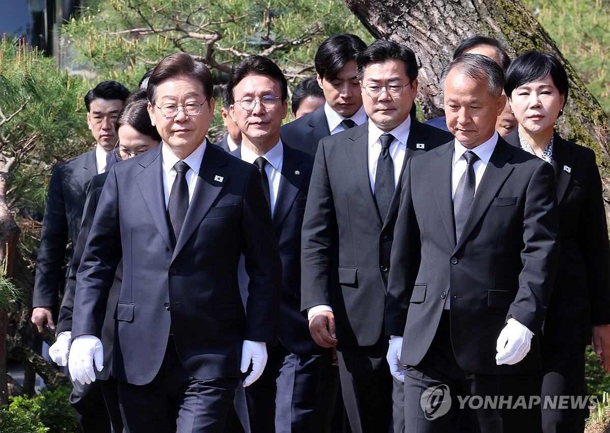 (서울=연합뉴스) 임형섭 안정훈 기자 = 더불어민주당 이재명 대선 후보는 28일 후보 선출 후 첫 일정으로 전직 대통령 묘역 참배를 위해 서울 동작구 국립현충원을 찾았다.