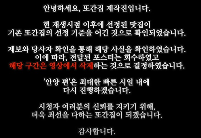 '또간집' 측은 "최근 공개된 ‘또간집 안양 편’ 에서, 1등으로 선정된 맛집이 또간집 선정 기준을 어긴 사례가 확인되었다"며 "일반인 출연자분의 발언 중 ‘가족관계가 아니다’는 내용이 사실과 다름을 직접 확인했다"고 밝혔다.