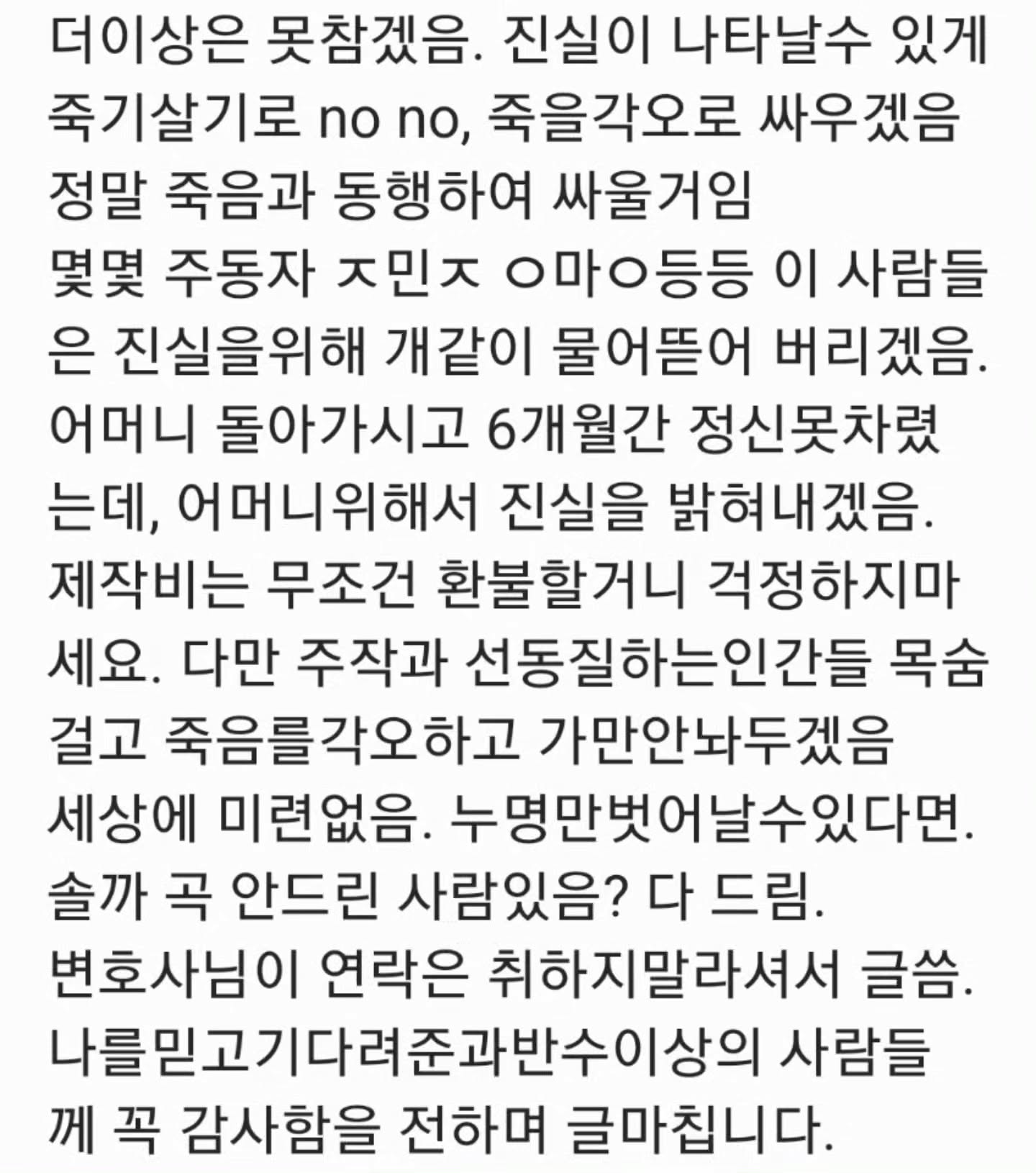 그러면서 "다만 주작과 선동질 하는 인간들 목숨을 걸고 죽음을 각오하고 가만 안 놔두겠다. 세상에 미련없다. 누명만 벗어날 수 있다면"이라고 덧붙였다.