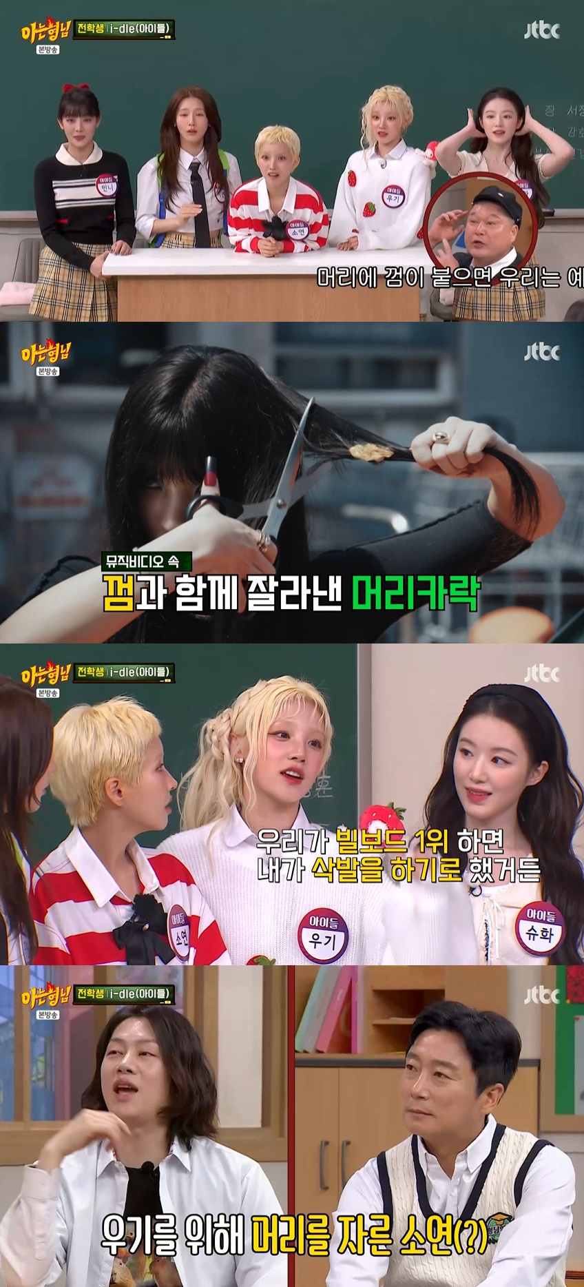 이에 우기는 "머리 보고 굉장히 떨렸다. 우리가 빌보드 1위 하면 내가 삭발하기로 했다"며 본인의 삭발 미래(?)를 향한 두려움을 드러냈고, 소연은 "내가 미리 해봤다"며 너스레를 떨었다.