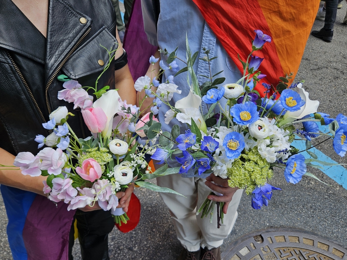 성소수자 정체성을 상징하는 '프라이드 플래그' 색의 꽃다발을 만들었다는 유모(30)씨는 "보통 깃발을 많이 흔드는데 이번에는 특별하게 보내고 싶어서 꽃다발을 가져왔다"고 말했다.