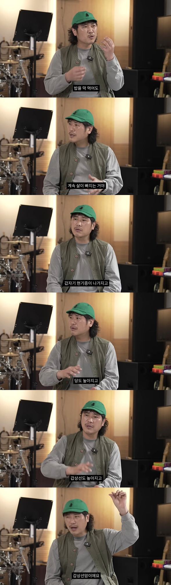 하지만 이후 이상 증세가 나타났다. 그는 "어느 날 현기증이 났다. 밥을 그렇게 먹고 고기도 먹고 했는데 쓰러진 거다. 놀래서 병원을 갔다"며 "스트레스 때문에 당도 높아지고, 갑상선도 높아지고, 다 높아진 거다. '이거 넘으면 이제 갑상선암이에요', '당뇨예요' 이렇게 끝까지 올라갔다"고 털어놨다.