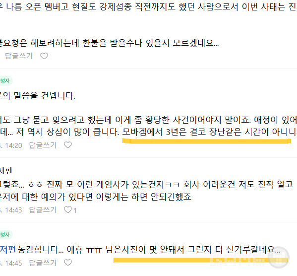 다른 이용자는 "처음에는 그냥 묻고 잊으려고 했는데, 이게 좀 황당한 사건이어야지 말이다. 상심이 크다. 모바일게임에서 3년은 결코 장난 같은 시간이 아니다"라고 했고, "뭐 이런 게임사가 있는 건지. 회사 어려운 건 알고 있긴 했지만 이건 이용자에 대한 예의가 있다면 이렇게 하면 안 됐다"며 분통을 터뜨렸다. 또 다른 이용자는 "동감한다. 에휴 남은 사진이 몇 안 되어서 그런지 더 신기루 같다"고 했다.