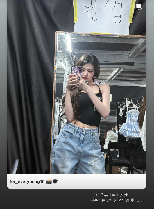 이어 최준희는 장원영의 SNS 사진을 공유하며 "제 추구미는 원영원영..."이라는 글을 덧붙였다. 장원영 또한 남다른 패션 센스와 슬렌더 몸매로 큰 인기를 끌고 있다.