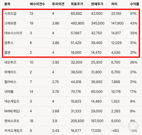 시프트업과 크래프톤, 목표 주가 수익률 투톱